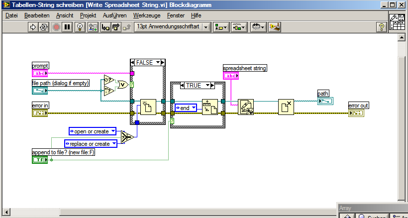 Vielleicht habe ich mit meiner Behauptung über die Altmodischkeit der Spreadsheet-VIs unrecht. Eines steht aber doch wohl fest: In einer Schleife sollte man sie wegen des jedesmaligen Öffnen und Schließens der Datei besser nicht verwenden.