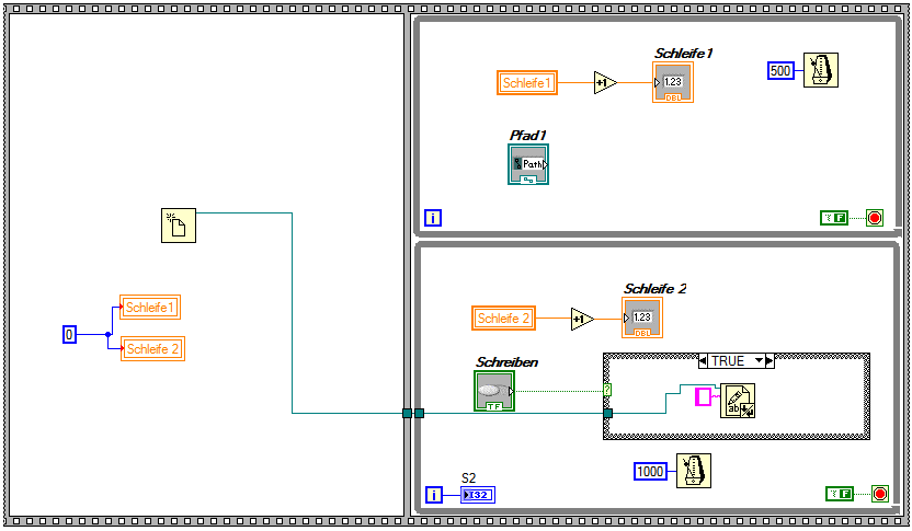 Lass Dich hier nicht irre machen: Da hast recht, die Schleife 2 müßte eigentlich weiterlaufen, und die Sequenzstruktur hat damit überhaupt nichts zu tun. Es dürfte eigentlich nicht sein. Es hängt am VI "In Tabellenkalkulationsdatei schreiben", es ist sozusagen ein Bug. Du kannst den Effekt vermeiden, wenn Du dieses VI nicht verwendest. Bei diesem VI handelt es sich meiner Meinung nach um eine Altlast aus uralten LabVIEW-Zeiten, welches aus Kompatibilitätsgründen bis jetzt mitgeschleppt worden ist. Es ist eine Art vorweggenommenes Express-VI aus einer Zeit, als die Express-VIs noch nicht erfunden waren.