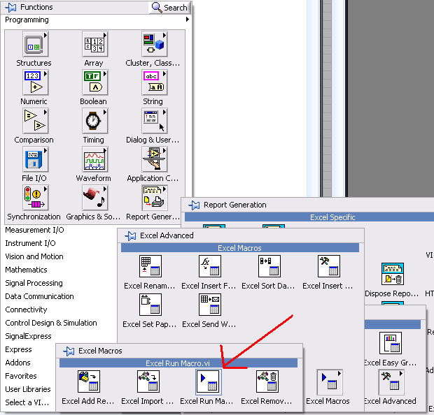 ' schrieb:Da gibt's unter "Report Generation" -> "Excel Specific" -> "Excel Advanced" -> "Excel Macros" das VI "Excel Run Macro.vi". Damit sollte es funktionieren. Ich verwende "Word Run Macro" und da klappt es problemlos.