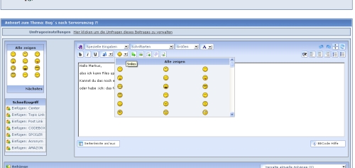 1. "Bug": Wo ist die Smilies-Auswahl beim Antworten/Editieren von Beiträgen? Irgendwie ist hier alles so in die Breite gezogen.