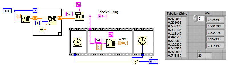 Die von Mike empfohlenen Funktionen "Tabellenstring nach Array" und "Array nach Tabellenstring" sind fertige VIs, die sich bestens für Deine Aufgabe eignen. Hat das einen Grund, daß Du dafür eigene Sub-Vis gebastelt hast, die 300 mal langsamer sind? Vielleicht habe ich eine Anforderung übersehen.