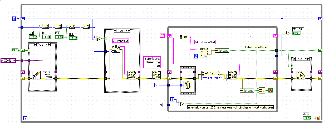 vielen, vielen Dank fuer deine/eure Anregungen. Habe allerdings noch eine Frage wie sehen die False-Bedingungen der 3 Case-Structures aus? Kannst du die vielleicht auch noch posten? Das waere echt nett. Den Rest habe ich trotz einiger Schwierigkeiten (keine LabVIEW Erfahrung) umsetzen koennen.