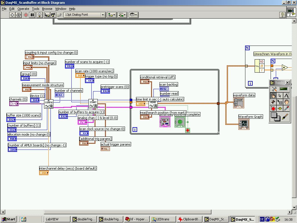Das klappt im Prinzip auch, die Messwerte werden in den Buffer aufgenommen. Allerdings misst er immer nur 1s lang, obwohl die scan rate, die number of scans to aquire und die buffer size