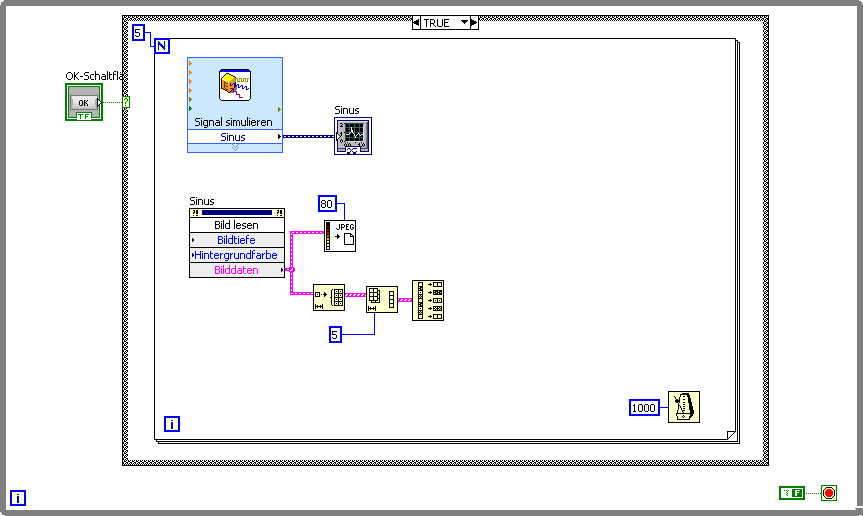 Außerdem hab ich das Problem, dass der Funktionsgenerator nur beim Abspeichern läuft, was mir auch einläuchtet da dieser ja auch in der For-Schleife ist. Allerdings fehlt mir momentan eine Idee wo ich Ihn sonst unterbringen könnte. Da er, wenn ich ihn außerhalb der Schleife unterbringe, komplett während des gesamten Speichervorganges stehen bleibt und ich somit fünf gleiche Bilder habe. Wie schon gesagt bin ich LabVIEW-Neuling und würde mich sehr freuen wenn Ihr mir helfen könntet, damit ich das auch irgendwann mal richtig verstehen und anwenden kann.