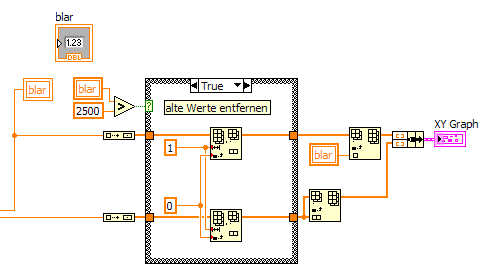Deinen XY-Graph erzeugst du, indem du skalare (Einzel-)Werte in ein Array packst, diese Werte dann teilweise wieder raus löscht, nochmal ins Array einfügst... Was willst du denn da erreichen?