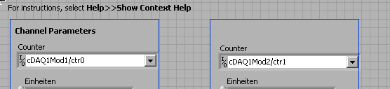 Ich denke, daß Du es im Wesentlichen richtig gemacht hast - eine eigene Task für jede Erfassung, genau so steht es in der Hlife. Was aber nicht sein kann: Beide Tasks beziehen sich auf das gleiche Gerät "cDAQ2Mod1/ctr0". Es sind zwar gleiche Karten, aber auf verschiedenen Steckplätzen, und deshalb müßten ihnen auch vom M&A-Epxploer verschiedene Namen zugewiesen worden sein. Wahrscheinlich hast Du das manuell in die Felder eingetragen, das solltes Du nicht tun. Also: Auf das Dreieck rechts des Feldes klicken und dort die Auwahl treffen.