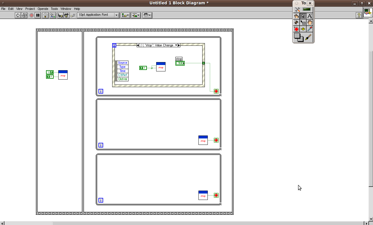 "Stop" müsste beim 1. Klick die innere Schleife verlassen, sofern Start nicht "true" ist. Ist das Schaltverhalten des Start-Buttons auf "Latch" eingestellt, würde ich sagen, dass es funktioniert.