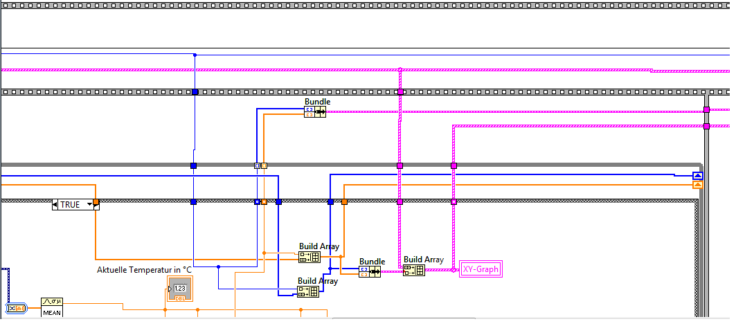 Die blauen Linien sind die Anzahl der Zyklen, welche von einer For-Schleife abgegriffen werden. Die dickere blaue Linie stellt ein Shift-Register dar, welches die Anzahlen der Zyklen in einem Array speichert. Analog funktioniert das ganze mit den orangenen Linien, diese sind Werte aus der Messkarte für die Länge. Die dickere orangene Linie ist benfalls ein Shift-Register, welches alle Werte speichert und an das Array weitergibt. Beide Arrays werden gebündelt und in den Graphen gepackt.Wie kann ich nun die Min/Max-Werte am Besten abgreifen?