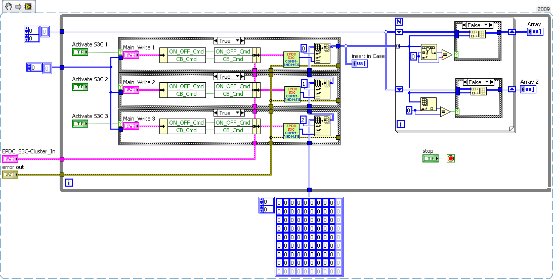 Die Schleife soll, wenn ein Case aktiviert ist, aus dem Cluster die jeweiligen Werte holen, und im SubVI (EPDC_S3C_Command) ein Array daraus erstellen, das dann ein Format hat, das ich direkt auf den CAN schreiben kann. Ein Case steht also immer für ein Gerät am CAN.
