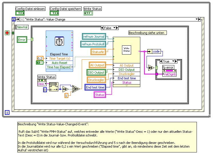 [*]2 normale While-Schleifen, welche lediglich mehrere Events abfangen. In der 2. Schleife (nennen wir sie event-loop) wird ua. auch das "Write status"-Value-Changed-Event abgefangen (Screenshot 3) und ein Sub-VI aufgerufen, welches wiederum die aktuellen Werte in die Protokoll-Datei schreibt<>