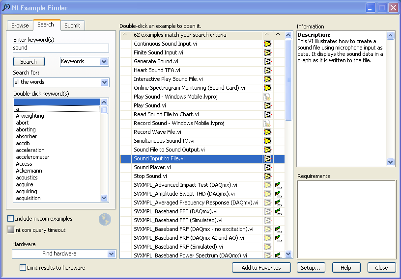 Da ich mich in meiner Schule bereits im Abschlussjahr befinde muss ich dieses Jahr eine Diplomarbeit über ein (medizin)technisches Fach meiner Wahl machen. Dabei bin ich mit 2 Schulkollegen auf die Idee gekommen, ein Stethoskop digital zu realisieren. Wir haben die Elektronik soweit fertig, d.h.: wir haben ein Mikrofon über dass wir unsere Signale messen. Das Signal wird dann über einen Verstärker in einen Speicher geschrieben. Und als letzte Funktion wollen wir die Daten Analog aus dem Speicher ausgeben (was dieser auch kann) und über die Soundkarte auf den PC schicken. Mein Diplomarbeitsbetreuer meinte, dass das am einfachsten mit Labview zu realisieren wäre. Nach diesem Rat hab ich mich bereits in mehreren Foren durchgesucht, ob nicht jemand schon ein ähnliches Problem gehabt hat. Anscheinend ist das aber nicht der fall... Jetzt würde ich halt gerne wissen, welche Möglichkeiten es da gibt über die Soundkarte möglichst *.WAV Dateien aufzunehmen und zu speichern.