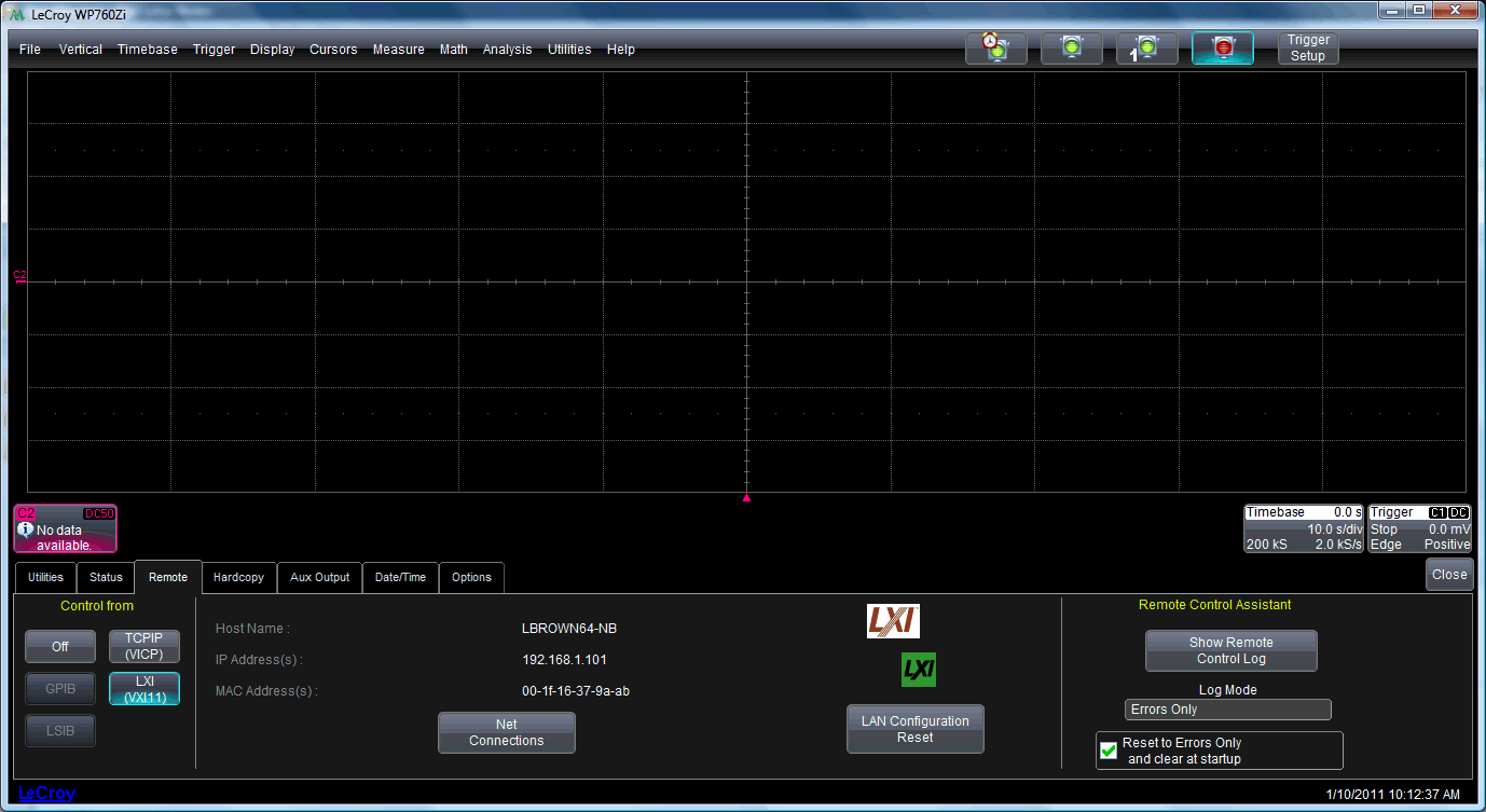 Select the "Remote" tab and in the "Control from" area, select the "LXI (VXI11)" button.