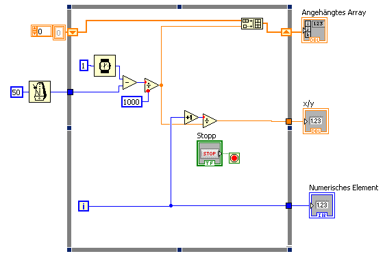 Um das Ganze zu verstehen, habe ich mir ein ganz einfaches Programm gebaut, in dem nur die Zeit in ein Array geschrieben wird. Als ich ein bischen damit herumspielte, fiel mir eine weitere Sache auf. Ich wollte z.B. mal genau 1000 Werte pro Sekunde haben, also benutzte ich das "Warten (ms)"-VI und stellte es auf 1 ms. Ich bekomme hier aber nur etwa 500 Werte. Wenn ich die Schleife nicht warten lasse sind es hingegen mehrere 1000 Werte pro Sekunde. Dies ist mein 2. Problem: Warum bekomme ich nur etwa 500 Werte pro Sekunde, wo ich 1000 erwarte? Am sonstigen Inhalt der Schleife sollte es nicht liegen, da die Schleife wie gesagt ohne Warten von 1 ms mehrere 1000 mal pro Sekunde läuft.