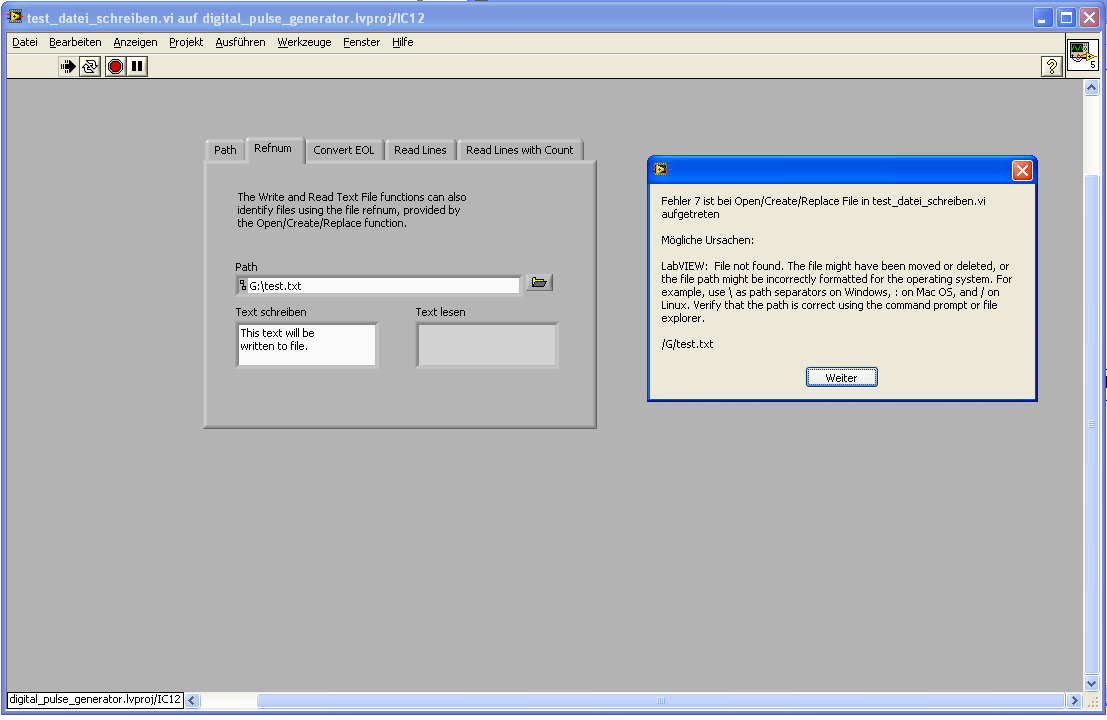 Obwohl du aktuell dein VI wahrscheinlich vom PC aus startest, so wird es doch auf dem cRIO ausgeführt. Somit hast du bei den Datei-Pfaden keine Zugriff auf die Verzeichnisstruktur des PCs! Du musst dich hier an der Verzeichnisstruktur des cRIO richten.