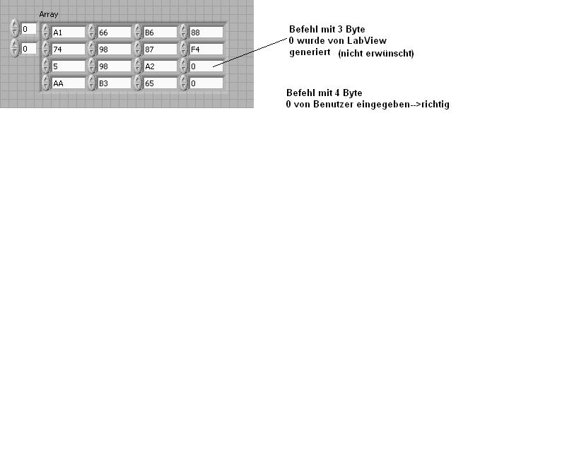 Ich habe folgendes Problem: Ich möchte Befehle für einen Sensor in hexadezimalen Zahlen in einem 2D A speichern und übergeben. Pro Zeile des Arrays soll ein Befehl gespeichert werden. Ein Befehl kann aus drei oder vier Bytes bestehen. Jedes Byte eines Befehls wird in einer extra Spalte gespeichert. Mein Problem ist nun das LabVIEW bei den Befehlen mit 3 Byte in das 4 Byte eine 0 ergänzt und nicht unbelegt lässt. Das bringt den Sensor aber durcheinander weil er einen 3 Byte Befehl erwartet und keinen 4 Byte Befehl. Ich kann die nullen aber auch nicht grundsätzlich herausschneiden da bei dem 4 Byte Befehl im 4 Byte unter umständen eine 0 stehen kann.