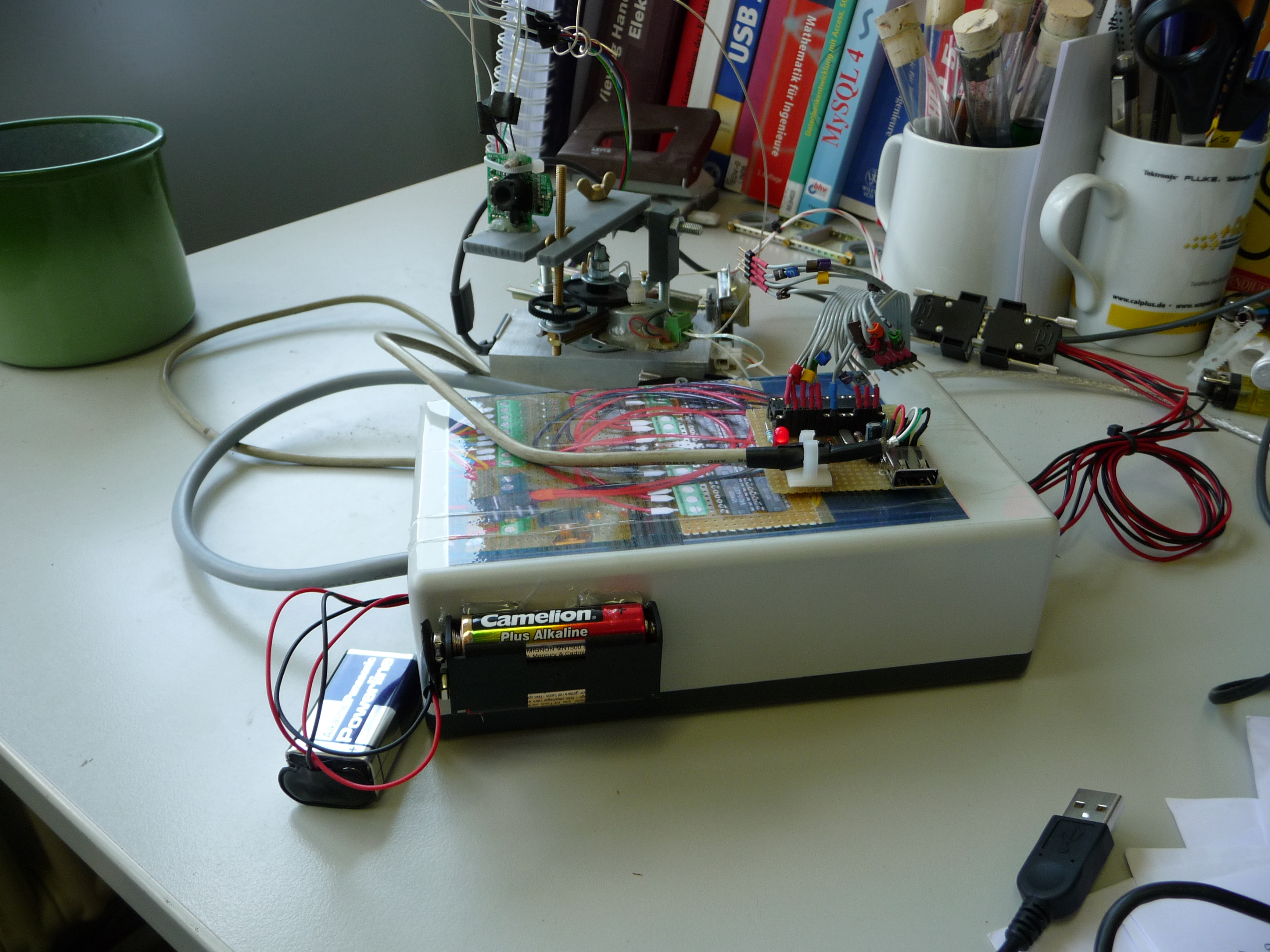 Zur automatischen Ansteuerung der Motoren wird ein Rahmen gewählt, in dem das Ziel sich befinden kann, ohne das die Verfolgung aktiv ist. Verlässt das Ziel diesen Rahmen, werden die Motoren aktiv geschaltet (bzw. einzeln oder gleichzeitig). Es ergibt sich von selbst, wenn das Ziel links aus dem Rahmen ist, dass der Motor 1 nach links schwenkt und umgekehrt, zudem wird die Bedingung gesetzt, dass wenn das Ziel das Bild komplett verlässt die "Verfolgung" deaktiviert wird. Man hat also ab diesen Punkt ein kleines System, welches aktiv Dinge verfolgen kann. Auf den Bildern ist noch eine kleine Platine mit einer LED zusehen, dies ist ein USB2LPT Konverter, da mein EEE PC keine LPT Schnittstelle besitzt.
