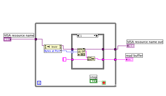 Ich habe die while-Schleife nun rausgenommen und das Programm um ein VISA Close am Ende und ein VISA Configure Serial am Anfang erweitert. Beim Configure Serial sind die default-werte glaub ich in ordnung. Ändert allerdings nichts an der Ausgabe des VI's.