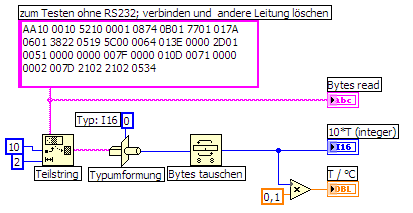 Über die Com1 bekomme ich einen String von 58 Bytes und davon benötige ich nur einige. Zwei zusammenhängende Bytes stehen für einen Temperaturwert und den möchte ich mir in LV anzeigen lassen.