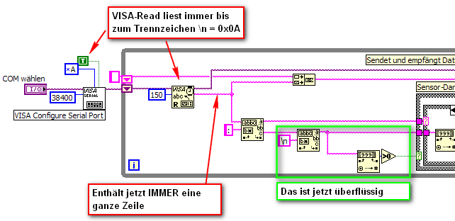 Wenn Du stattdessen immer nur soundsoviele Byte liest, kannst Du nicht erwarten, daß das letzte gelesene Byte immer das Ende einer Zeile ist. Sehr beliebt ist bei Anfängern auch die unpassende Verwendung von "Bytes on Board" mit anschließendem Auslesen dieser Bytes. Wenn ich das sehe, wird mir immer ganz schlecht Cool