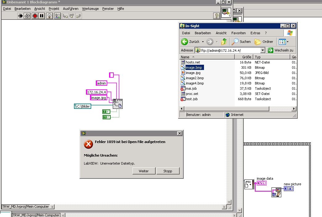 1. Weg: über die Internetfunktionen "FTP get File" das Bild auf die lokale Festplatte z.B. C://Bilder/ kopieren und von da aus über die Bildfunktion "JPG-Datei lesen" anzeigen. - Hier kommt immer die Fehlermeldung vom "FTP Get File": "1059 - unerwarteter Dateityp"