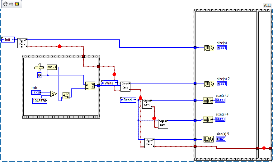 (10.01.2012 15:19 )abrissbirne schrieb:  Dein Read-Case ist in der Tat suboptimal. LabVIEW ist eine byValue sprache und jeder Drahtabzweig bedeutet eine Datenkopie. Sowie GerdW den Readfall geändert hat, sollte diese unnötige Speicherallozierung behoben sein.