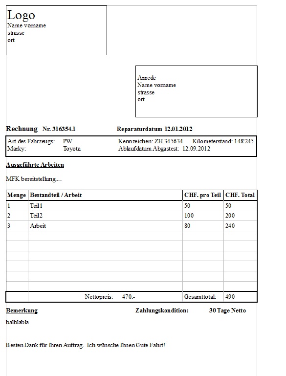 Prinzipiell kannst du dir ja deine Vorlage in Excel oder Word erstellen und dann deine Daten eintragen.