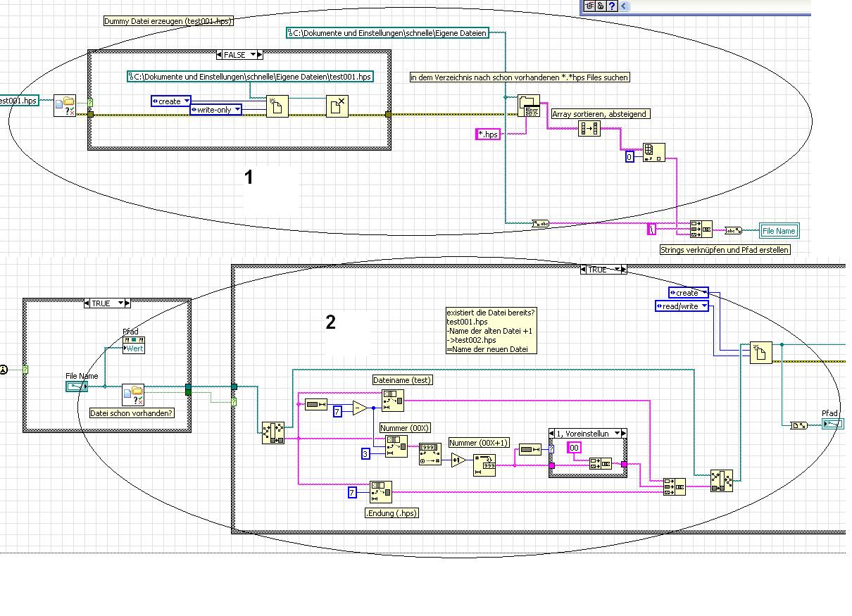 Ich scheiter momentan einfach daran, den einemal eingegeben Dateipfad/Dateiname, zu umgehen und auf das zuletzt erzeugte File zu schauen, damit die Endung bei erneutem Ausführen des VI inkrementiert wird. Ich werd mal gucken ob mir deine Tipps weiterhelfen.