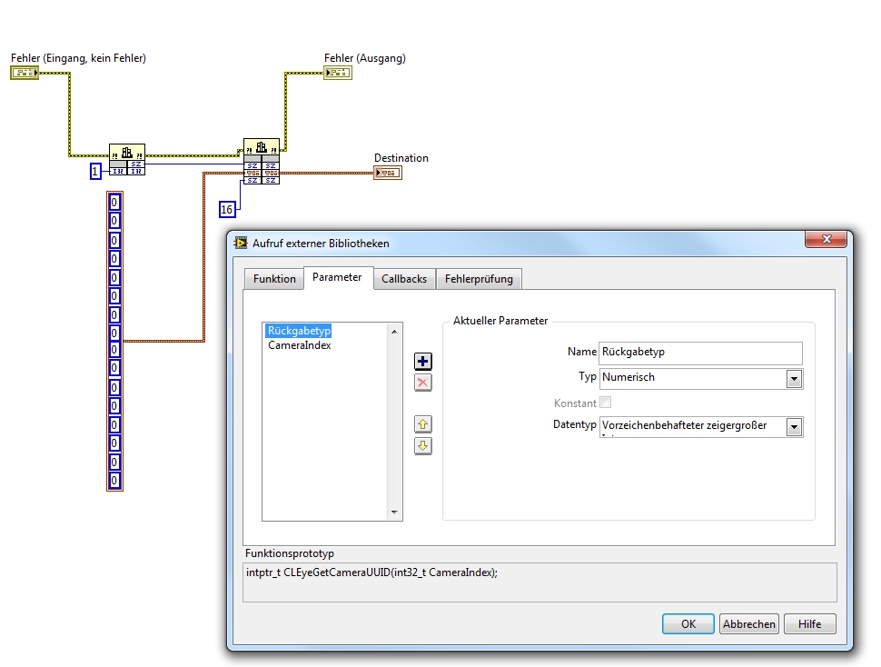 Nun will ich die nächste Fnktion ansprechen die mir die UUID der angeschlossenen Kamera ausgibt. Ich füttere die Funktion mit dem Kameraindex (hier 1) und setze den Dll-Knoten Rückgabewert auf "zeigergroßer integer". Jetzt kann ich diesen Pointer in eine zweite MoveBlock Dll-Knoten einbringen der mir dann die hinterlegten Daten (hier die UUID) in ein vorher initialisierten 128 bit Cluster schreibt. Den Bit-Cluster initialisiere ich mit 8 mal 8 bit Integer Werten (U8). Erwarten würde ich nun das am Ausgang meiner MoveBlock konstruktion die UUID in den Cluster geschrieben wird. Stattdessen erhalte ich Fehlermeldungen an meinem ersten DLL-Knoten. Also dem der die eigentliche Funktion implementiert. Wo ist hier mein Denkfehler? Ich komm partout nicht dahinter....