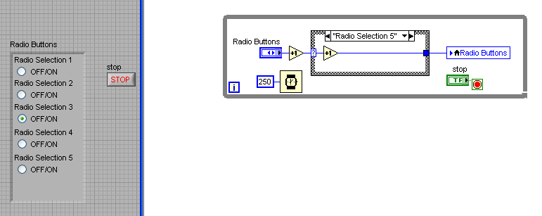 Die Zeit die ich für Radio buttons umschlatung gestellt habe, beinflusst mein ganzes Programm. Z.B die Erfasste Daten müssen auch verzögert werden. weil die Radio Button sowie Datenerfassung Sub.VI in eine While schleife sind.