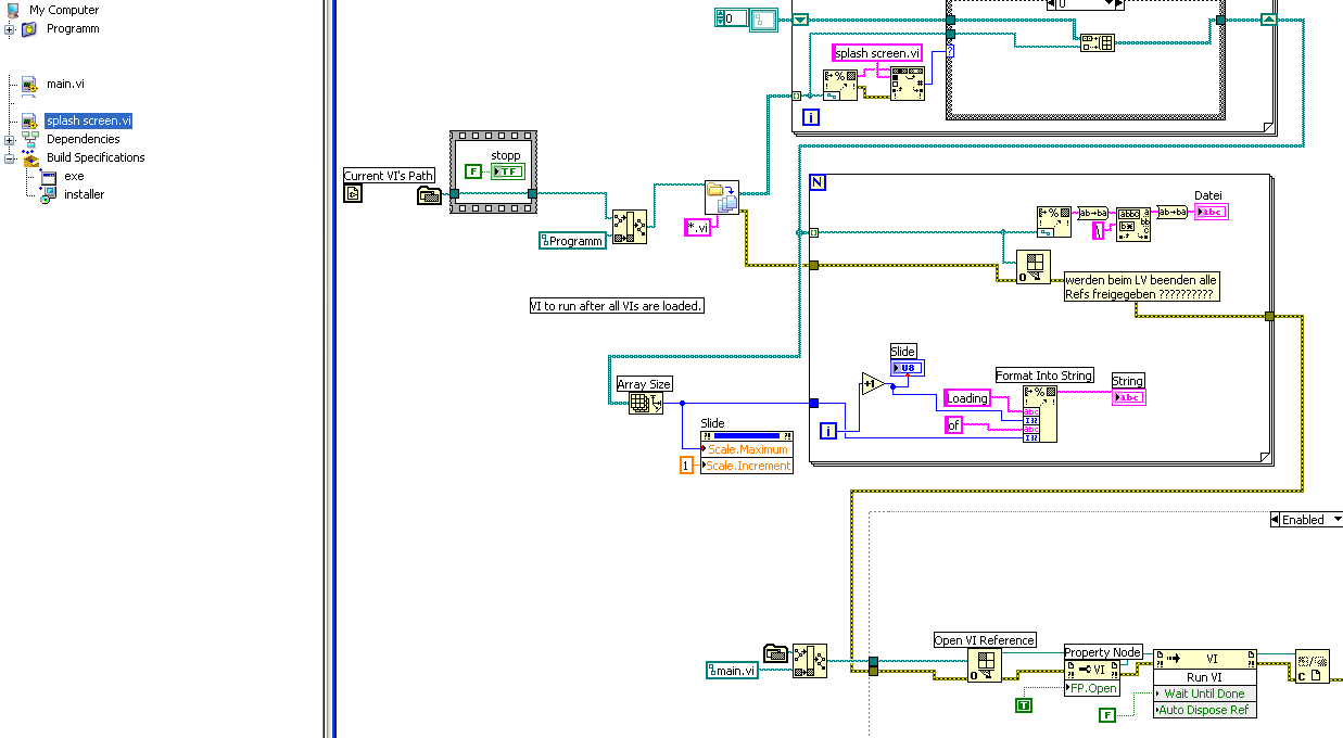 Im Splash Screen sollte die Fortschrittleiste bis auf z.B. 100% laufen, dann sollte das main aber auch wirklich geladen u. gestartet sein. Momentan läuft die Fortschrittleiste super kurz an (also main.vi ist doch recht schnell geladen) und dann stoppt die F.leiste und es dauert bis das main.vi gestartet ist und tatsächlich läuft.
