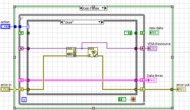 Vielen Dank für den Hinweis mit der action machine. Ich schau mir das gerade mal im Detail an: Du nutzt einen Eigenschaftsknoten, um die Anzahl der am Port vorhandenen Bytes auszulesen. Falls bei "open" welche vorhanden sind, löschst Du diese (wieso?). Bei "aquire" liest Du ebenfalls die Anzahl der Bytes am Port aus, und falls diese einen Grenzwert erreichen, führst Du VISA-Read aus und akquirierst die Daten. Ist es nach jedem VISA-Read-Befehl nicht notwendig, die Bytes am Port zu löschen oder geschieht das automatisch? Bevor Du VISA-Close ausführst, löschst Du ebenfalls nochmals alle Bytes am Port. Ist das zwingend notwendig?