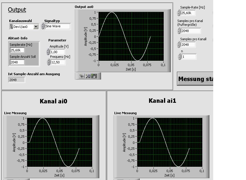 Also ich möchte mit dem Programm die Hardware NI usb 4431 wie folgt ansteuern: Ausgabe eines (Sinus)Signals über den AO und Erfassung der Signale der Eingänge Ai0 bis Ai3.