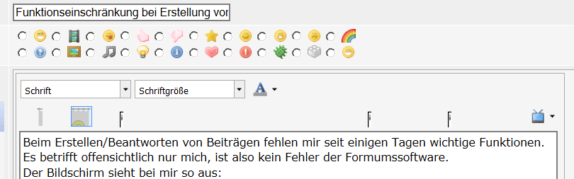 Beim Erstellen/Beantworten von Beiträgen fehlen mir seit einigen Tagen wichtige Funktionen. Es betrifft offensichtlich nur mich, ist also kein Fehler der Formumssoftware.