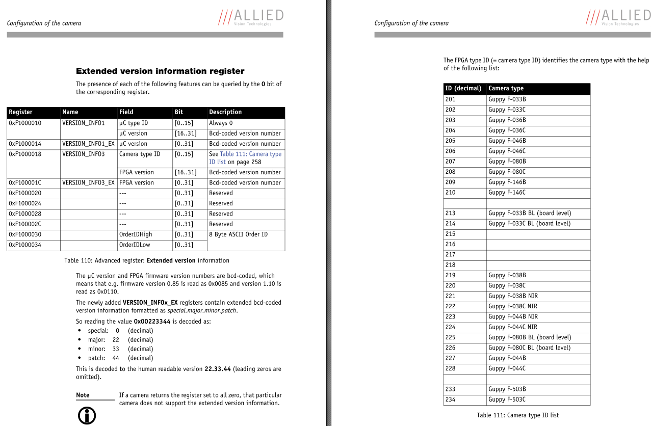 Ich steuere momentan über IMAQdx eine Kamera an, AVT Guppy 036C mit Firewire. Das Problem is, dass ich mit IMAQdx an dessen Grenzen stoße, da bestimmte Parameter der Kamera nur über das Register (IIDC 1394-based) zu schreiben bzw. auszulesen sind. Das is für mich komplett neu, hab mich aber den letzten Abend etwas mit der Sache auseinander gesetzt und ein bisschen rumprobiert. Im Technical Manual HIER sind die RegisterAdressen beschrieben und wie die zurüchgelieferten Werte zu interpretieren sind (32-bit, Big Endian), und genau da beginnen aber schon meine ersten Probleme.