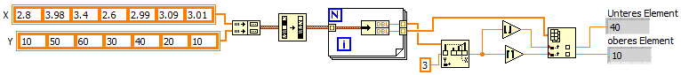Ich suche jedoch einen beliebigen Wert (nicht den maximalen o.ä.), wie gehe ich da vor. Beispiel, finde den y-Wert zu x = 3. Problem an der Sache ist, wahrscheinlich gibt es den x-Wert 3 so gar nicht, sondern nur einen Wert der sich einmal links und einmal rechts neben der 3 befindet. Und um das ganze jetzt ganz schlimm zu machen, die Stützstellen sind je nach Einstellung unterschiedlich weit entfernt, so dass es für mich auf Anhieb nicht möglich war, den Treshold-Baustein zu verwenden, da dieser eine Breite als Input fordert. Alternativ könnte ich das Array sortieren und über Differenzbildung den Wert raussuchen, der