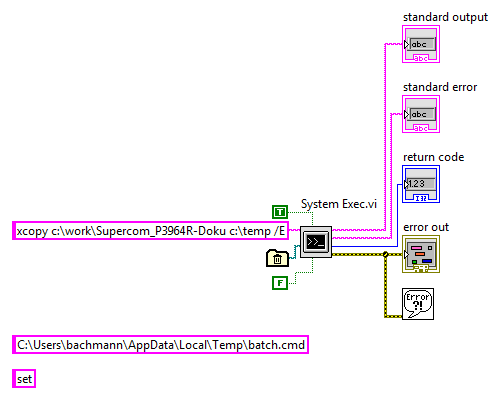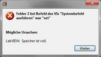 Ich habe jetzt auch mal versucht, den Befehl "set" (liefert mir viele gesetzte Umgebungsvariablen) auf diese Weise auszuführen. Da bekomme ich aber den Fehler 2 (Befehl des VIs "Systembefehl ausführen" war "set") und keine Ausgabe. Was könnte denn da noch nicht stimmen?
