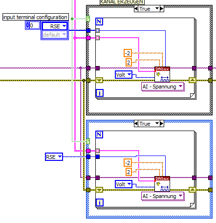 Zitat:Ich meinte, dass im unteren Fall (blaue Case Struktur) die Eingänge in die Struktur zum VI "Kanal erzeugen" tatsächlich Arrays sein müssen (sofern sie von außerhalb IN die case-struktur) reingehen. Siehe "input terminal configuration" Will man das Array "RSE...." von unten mit dem oberen Case (grau) verbinden, so geht das NICHT!!!!!