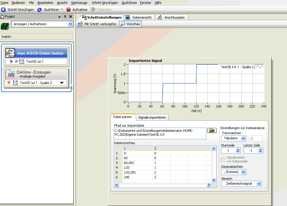 Schritt hinzufügen – Signale erzeugen – DAQmx erzeugen - Analoge-Ausgabe-Spannung- und Dein Kanal auswählen - jetzt müsste SE meckern von wegen fehlender Eingangswert – und ein Neues Fenster poppt auf – Signale laden/speichern – Analoge Signale – Aus ASCII-Datei laden – In den Schritteinstellungen die Textdatei wählen und in den Reitern die Einstellungen anpassen.