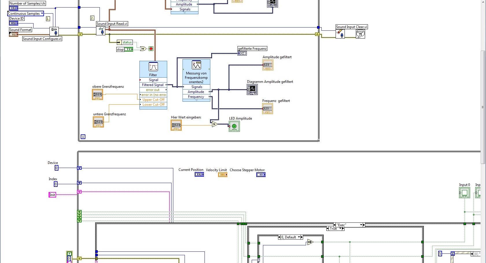 Natürlich kannst du das Parallel laufen lassen. Das Vi läuft parallel, wenn es nicht vom Datenfluss an das bisherige Programm gebunden ist. Heißt, wenn es zum beispeil in einer speraten zum Hauptprogramm parallelen Schleifen läuft. Du könntest z.B. Das boolsche Element 'LED Amplitude' verwenden, um ein Event auslösen zulassen (Wiederrum mittels 'ValSignaling'), um von der parallelen Sound-Schleife in die Hauptschleife eventbasiert einzugreifen und so die Motorsteuerung zu beenden.