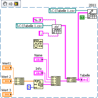Zusätzlich möchte ich das ganze noch innerhalb von LabVIEW in einer Tabelle darstellen, was beim ersten speichern, im Gegensatz zur CSV Datei, auch gelingt.