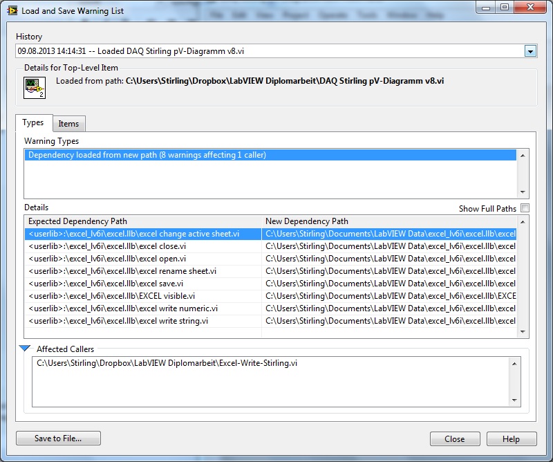 Ich habe jetzt grade mal das gesuchte VI aus der LLB selbst ausgewählt. Er öffnet dann das VI, bringt mir aber eine Warnung s. unten. Ausführen lässt sich das Programm auch nicht -> Fehlerliste im Anhang.