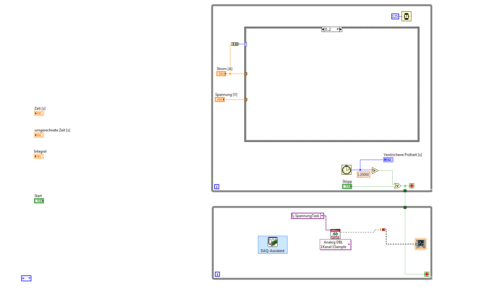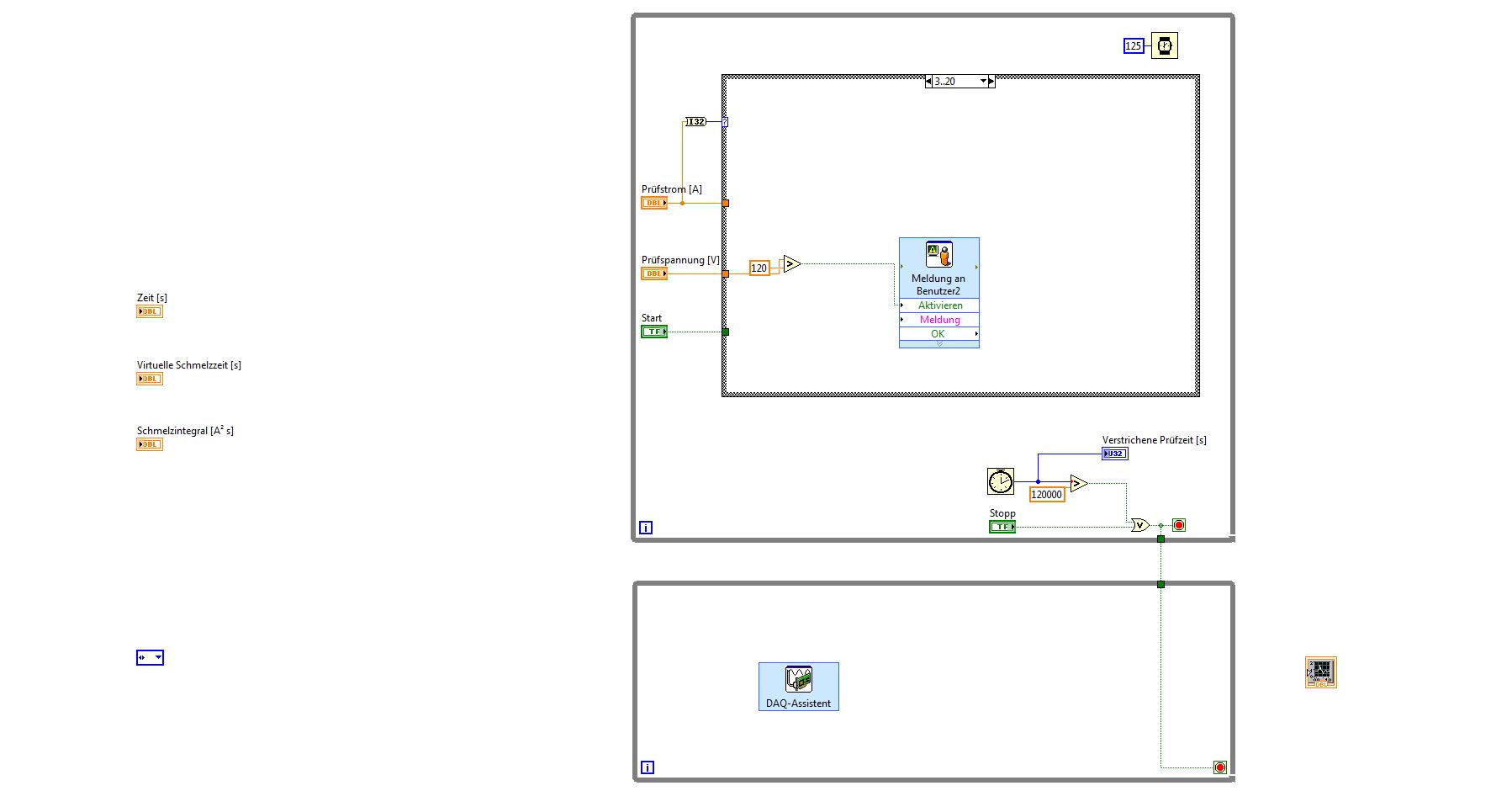 Danach startet die Prüfung: Diese kann durch Drücken des Stopp-Buttons, Öffnen einer Tür (diese ist mit einem Sicherheitsschalter versehen -> keine Spannung mehr über einem AI anstehend) unterbrochen werden und endet spätestens nach 30 s. (An den roten Anschluss der While Schleife einfach diese 3 Bedingungen mit oder verknüpft?)