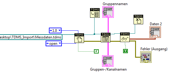 Ich hab jetzt also angefangen ein VI zu basteln und erreiche damit, dass ich mir zwar die Gruppen und Kanalnamen anzeigen lassen kann, aber wenn es um die konkreten Messdaten geht, bekomm ich nur den Bereich "Datum" aus meiner .tdms Datei.