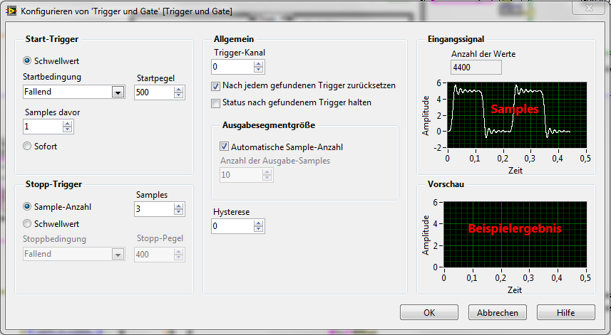 Ich nutze die express VI "Trigger und Gate" um ein gestörtes Sinussignal (analog mit Rauschen) zu zähle, in dem ich die abfallende Flanke bei 500 Bar erfasse!