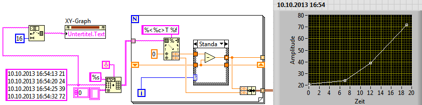 Die Ausgabe im Graphen muss aber variabel sein, das heißt sind nur 20 Messwerte gespeichert, sollen auch nur 20 dargestellt werden, sind es 200, dann brauche ich alle 200. Mit Excel habe ich das ganze hinbekommen, aber das ist ja eher unschön. Deswegen soll das ganze mit LV realisiert werden.