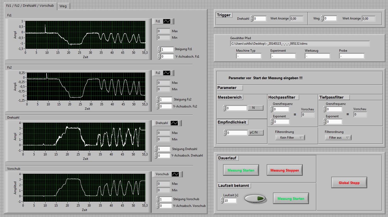 Ich habe einen Screenshot angehängt. In diesem Beispiel habe ich nur die Drehzahl verändert. Der Vorschub zeigt das selbe Signal an. Fz1 und Fz2 zeigen zumindest die selben "Bewegungen" im Graph. Hat dazu jemand eine Idee?