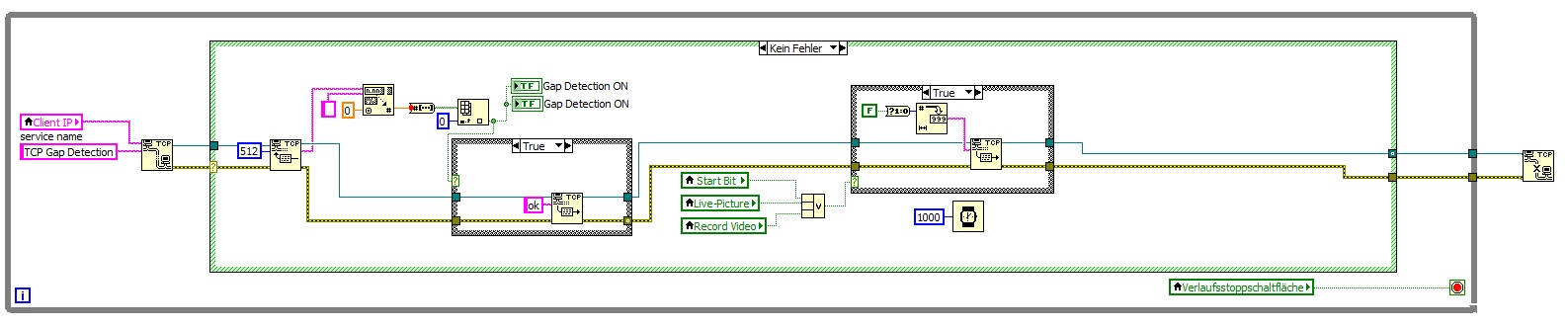 Ein Bit (True/False) wird von einem Client über TCP an einen Server gesendet. Dieser bestätigt dies mit "ok" an den Client. Der Client soll diesen Status so lange behalten, bis der Server ein weiteres Bit (False) an den Client sendet und der Status einer Schaltfläche (Gap Detection) auf Seiten des Client wieder von "true" auf "false" wechselt.