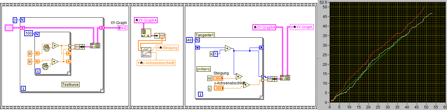 Wenn man das VI "Wiederholt ausführt" wird der "rot gestrichelte" Plot gezeichnet. Die Tangenten kann man "live" anpassen (wie es auch sein soll).