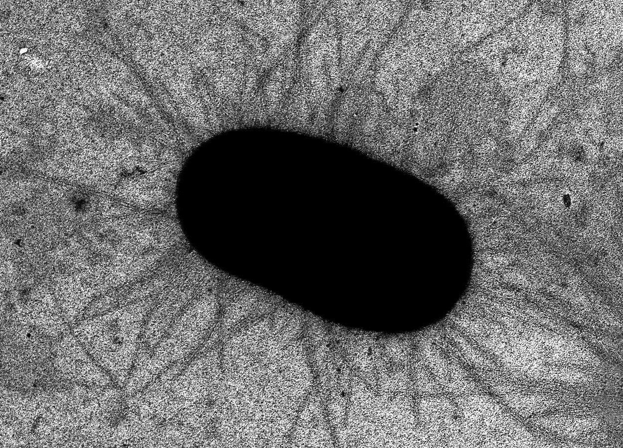 Also, es handelt sich um die Mikroskopaufnahme einer E. coli Bakterie. Die dünnen schwarzen Fäden sind 1-2 µm lange Fimbrien, über die ein direkter Kontakt zwischen Zelle und Bakterium entsteht.