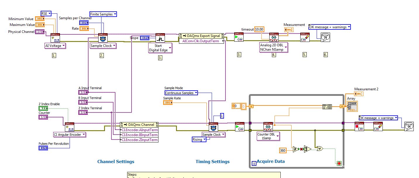 Anschaulich formuliert: bei einer Sample-Rate von 1 kHz für den Analogen Task bekommst du vom AI-Task ein n*1000 (n=Anzahl der Kanäle) Samples Array pro Sekunde zurück und vom Flanken-Zähler-Task bekommst du ein 1D-Array mit 1000 Werten, mit den Zähler-Ständen zum Sample-Zeitpunkt zurück. Damit kannst du im Rahmen deiner Auflösung im Post-Processing jeweils ein analoges Sample einem Zähler-Stand zuordnen, bzw. - wie oben bereits angedeutet - eine quasi-winkelsynchrone Abtastung (mit variabler Sample-Rate) ausrechnen. ==> also nix mit software-Timing oder Einzelwert-Abtastung ...